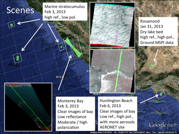 Thus far, six PODEX scenes in California and the nearby coastal Pacific Ocean have been compared, creating a total of 431 matchup points. These scenes were selected for their individual spatial homogeneity (to minimize sensitivity to the spatial registration process) and for the overall range of reflectance and polarization values.