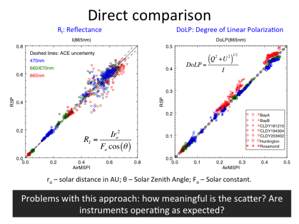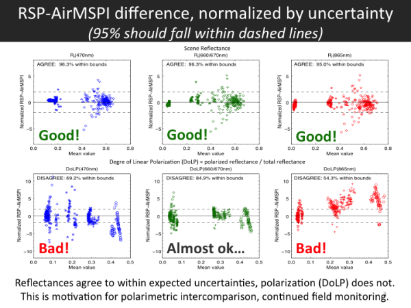 The RSP-AirMSPI difference plots show that 95% or more matchups of scene reflectances agree within the +/- 1.96 range, meaning that the uncertainty models of both instruments collectively represent the total (unpolarized) reflectance property. This is not the case for the Degree of Linear Polarization (DoLP), which is the ratio of linearly polarized to total reflectance. The worst channels are 470nm and 865nm, where only 69% and 54%, respectively, agree within uncertainty expectations. This means that the models used to characterize instrument uncertainty for polarization underestimate the total uncertainty, although this analysis cannot pinpoint which instrument is the source (and it could be both).