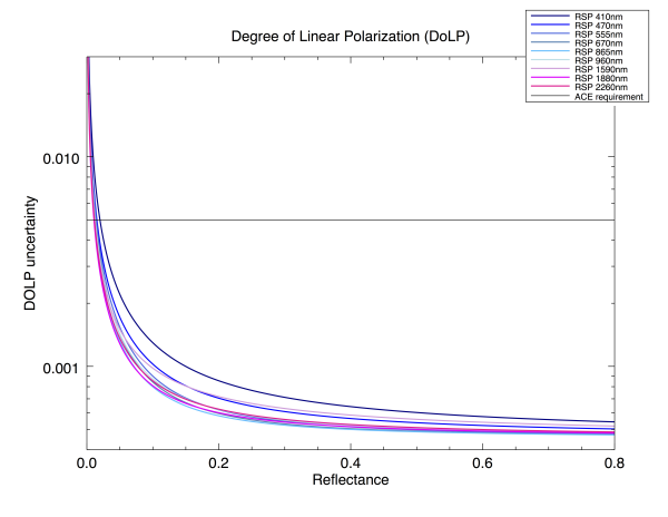 The analytical formulation of RSP Reflectance and Degree of Linear Polarization (DoLP) uncertainties are functions of both reflectance and DoLP, as described here. DoLP uncertainty is also minimally sensitive to the polarization angle. A simulation of these uncertainties as a function of scene reflectance are shown at left. ACE requirements are met for reflectances above about 0.025.