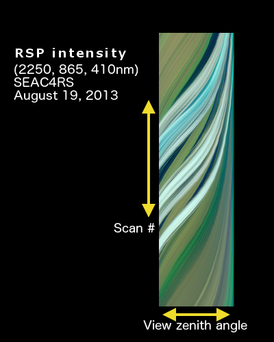 Image: RSP data acquired on August 19, 2013 during the SEAC4RS field campaign. Each row of image data represents a single scan by the RSP. Columns thus represent slices of varying scan number (location) at fixed view zenith angle, while rows represent varying view zenith angle at a fixed measurement location. The 'tilt' of an image feature represents the distance from that object to the RSP. Objects far from the RSP require many scans to pass from fore to aft viewing angles, as is the case for the green and dark blue surface features in the scene shown at right. Closer objects, such as the bright clouds in the image, are observed with less scans.