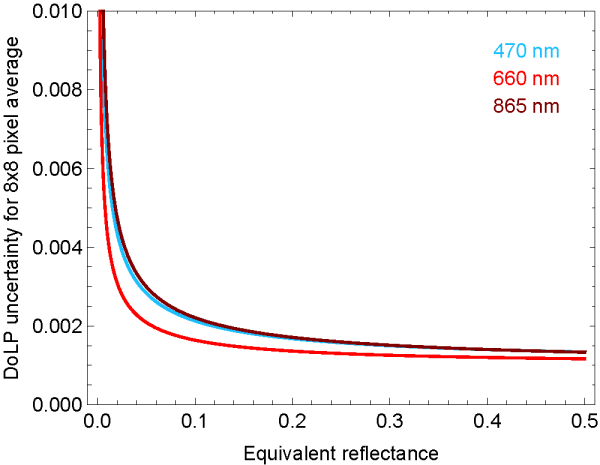 The analytical formulation of AirMSPI Reflectance and Degree of Linear Polarization uncertainties are functions of reflectance, as described here. A simulation of these uncertainties as a function of scene reflectance are shown at left. The largest contribution to uncertainty is noise, which can be reduced by spatial averaging. Since they are gridded to different spatial resolutions, the "step and stare" and "continuous sweep" are represented individually. Only the coarser spatial resolution "continuous sweep" mode meets ACE requirements for reflectances above about 0.3. DoLP uncertainty can be further reduced by coarser spatial averaging, until systematic (ie calibration) becomes the largest contribution to uncertainty.