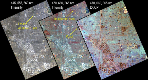Image: AirMSPI nadir imagery of Fresno, CA, acquired on 6 January 2012. The left and middle images are intensity data using different spectral band combinations. The right image displays DOLP in the three polarimetric bands. The images have been contrast enhanced to highlight details. The locations of the Fresno AERONET site, the pond, and the residential area are indicated. Figure from Diner et al, 2013a