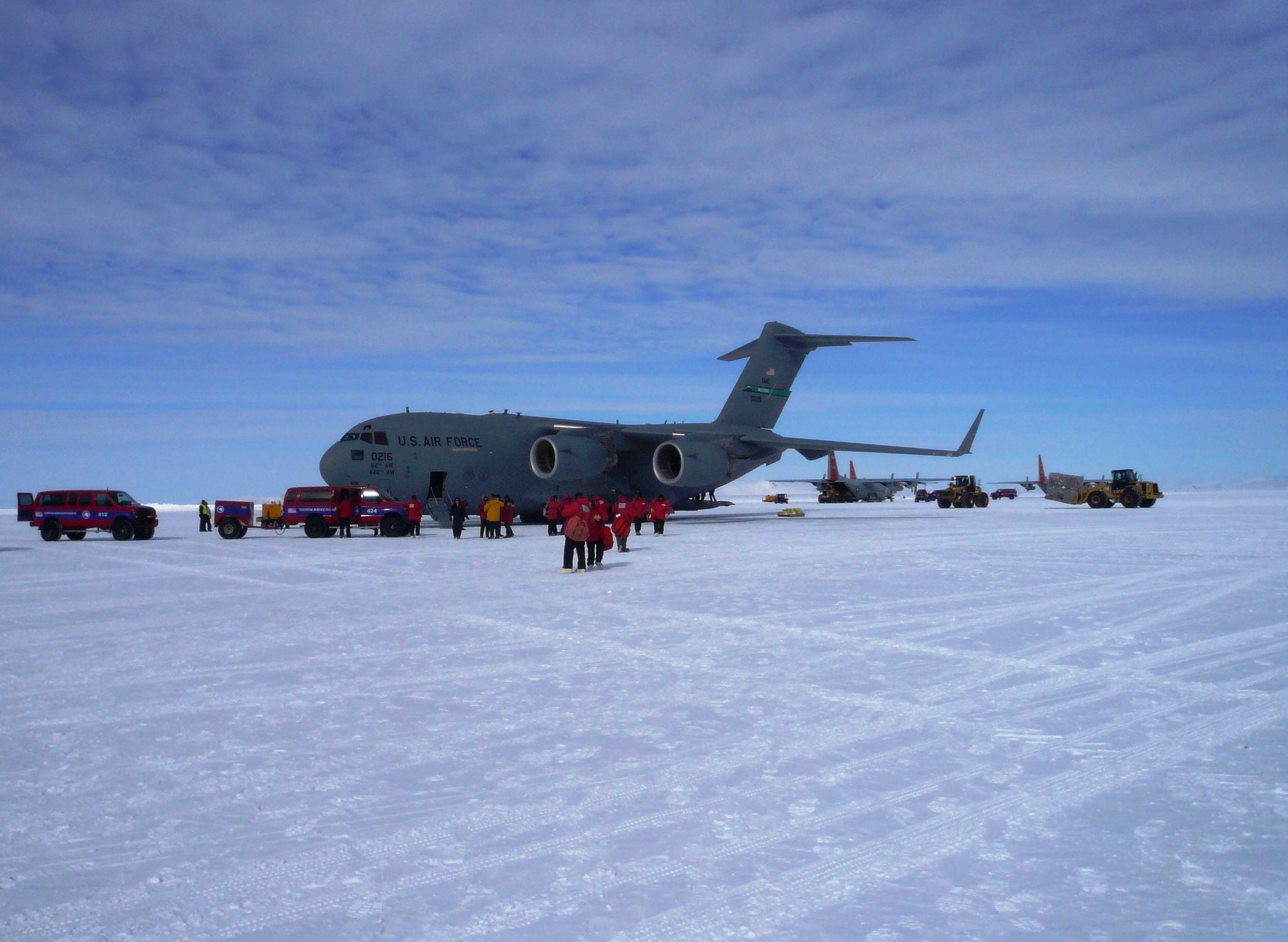 Members of the IceBridge team arrived at McMurdo Station Nov. 12, 2013 aboard a U.S. Air Force C-17 transport aircraft.