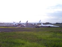 ER-2 mission manager, mobile pilot, and pilots celebrate a successful first science flight of the TC4 mission.