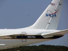 Tail of NASA DC-8 with P-3 take-off in the background.