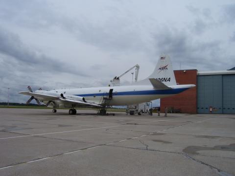 A cherry picker is used to reach instruments on the spine of the P-3.