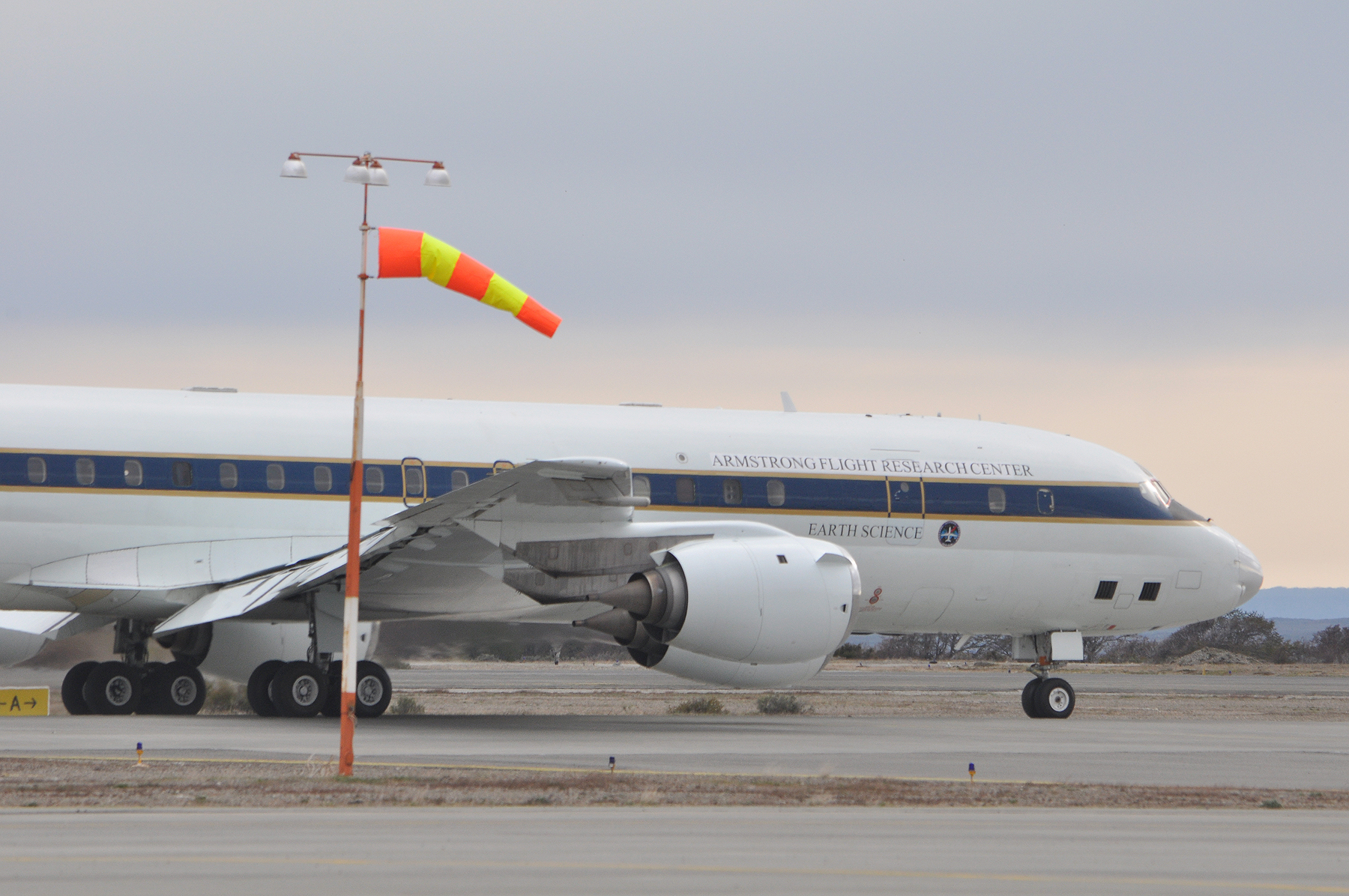 DC-8 passes by the airport wind-sock on its way to the runway at PUQ.