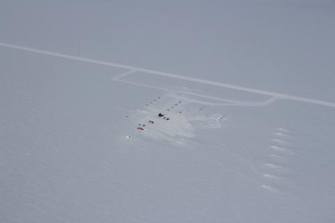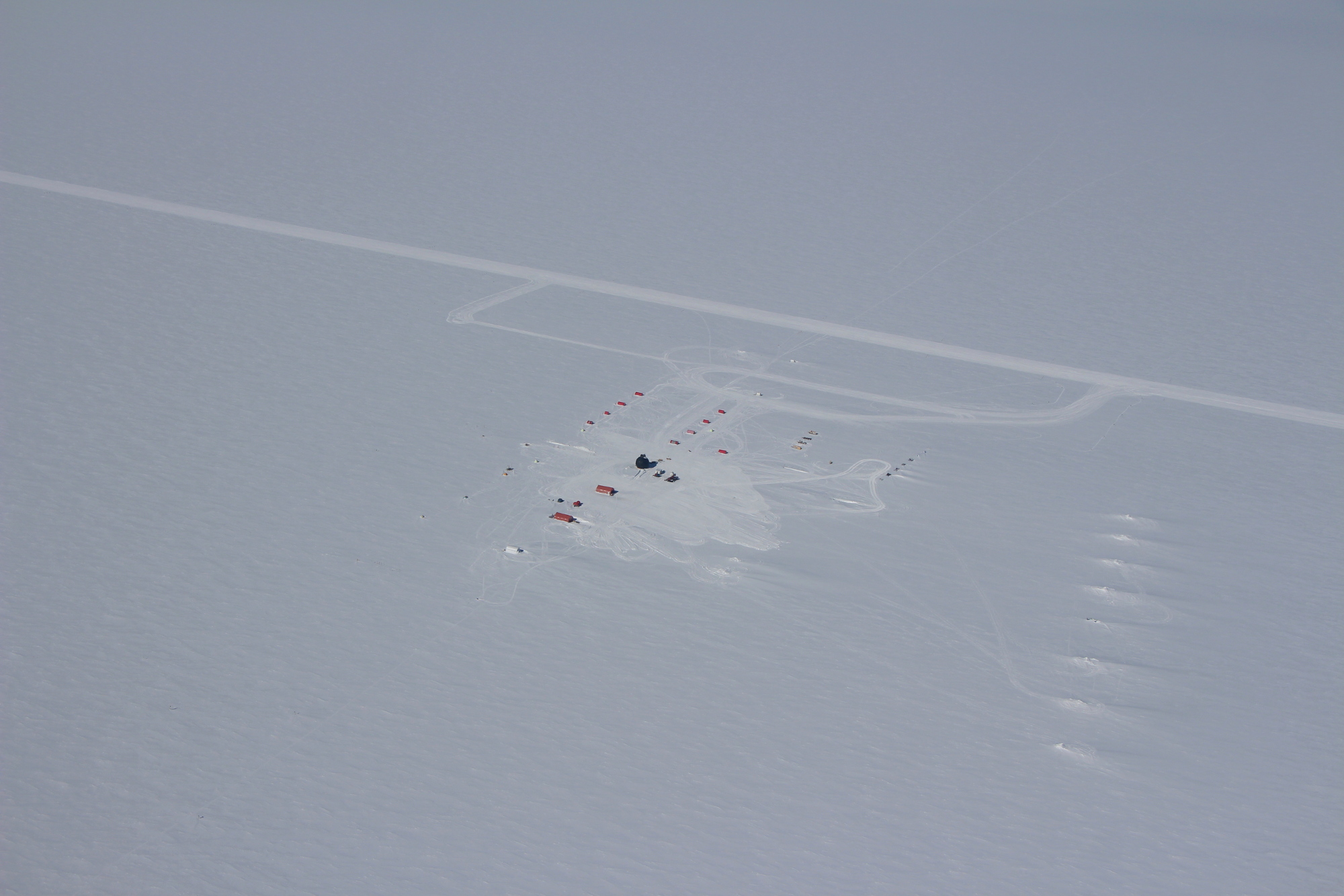East GRIP camp, a Danish-operated deep ice coring operation on the upper Northeast Greenland Ice Stream. The long, groomed skiway is visible past the camp structures.