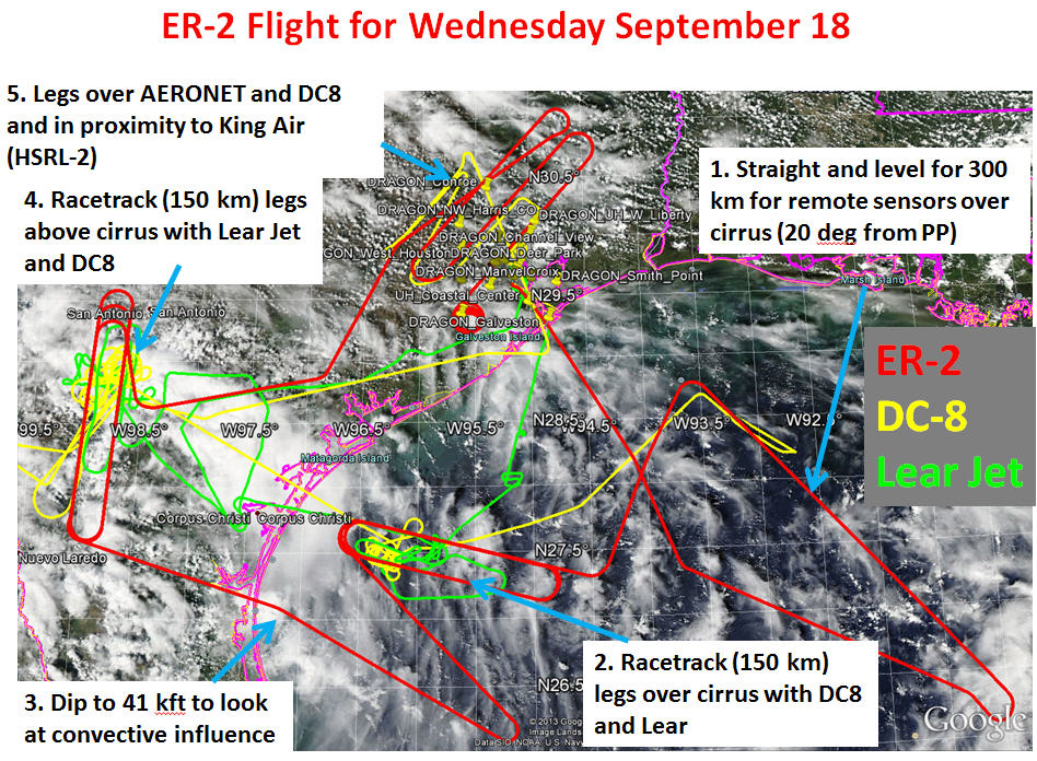 Figure 1. Flight tracks of ER-2, DC-8, and Lear Jet from September 18 on Aqua MODIS image. Subject Aircraft Mission SEAC4RS