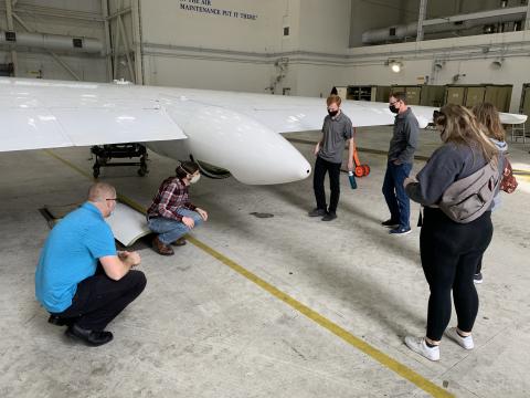 A group of local students get a look around the hangar where the ER-2 is housed while at Pope AAF.  Chip Helms (GSFC) delighted the group with a wealth of scientific information.