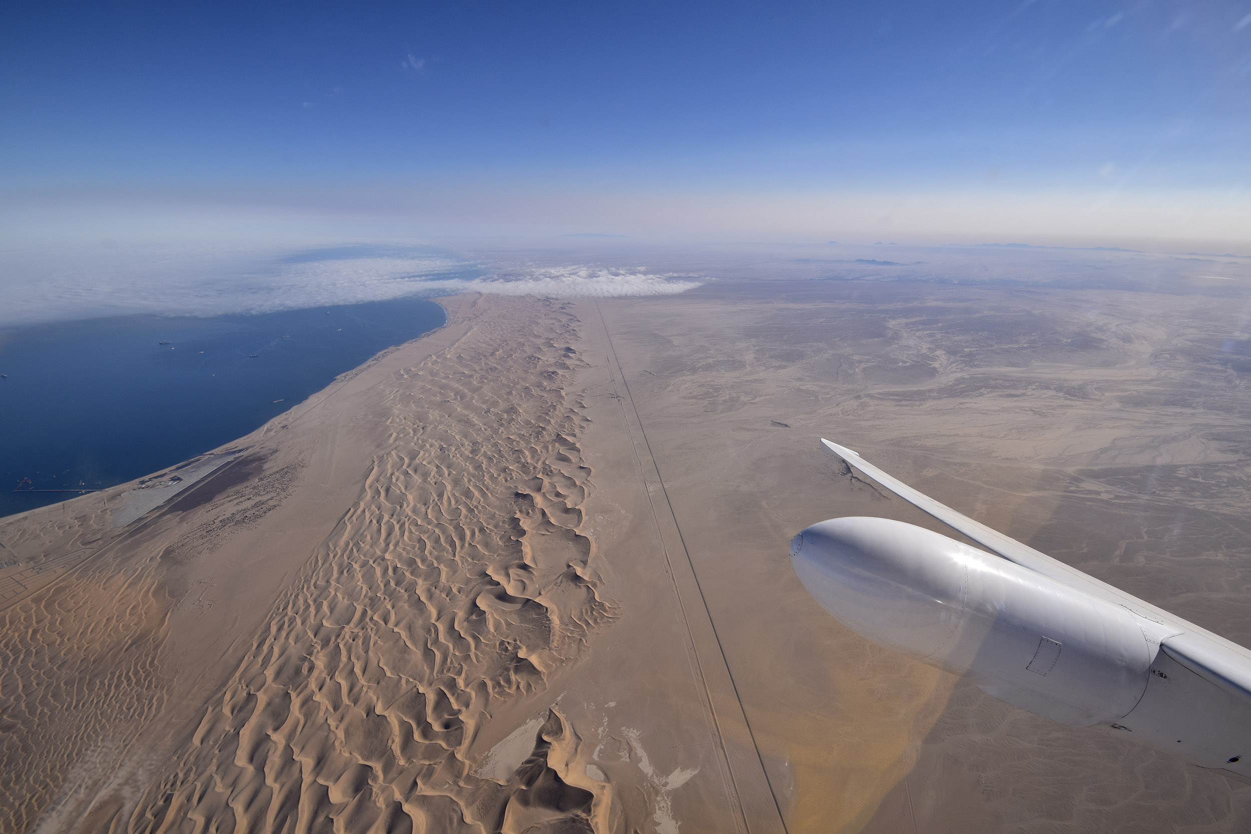 Two minutes after the first ER-2 takeoff out of Walvis Bay. The road to the right of the sand dunes runs from Walvis Bay Airport (behind the jet) to Swakopmund, beneath the clouds at the north end of the dunes in the photo.