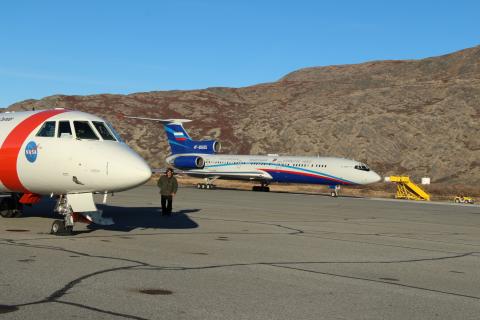 A Tupolev-154M belonging to the Russian Republic in the background, with the nose of our Falcon at left foreground. LaRC's Dean Riddick is near center. The Russian aircraft's markings identify it as an "Open Skies" treaty monitoring aircraft. Details of this fascinating but little-discussed international program can be found at https://en.wikipedia.org/wiki/Treaty_on_Open_Skies.
