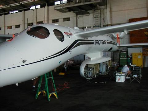 Proteus aircraft in Hangar during the CRYSTAL FACE mission. Subject Aircraft Aircraft Proteus Mission CRYSTAL FACE