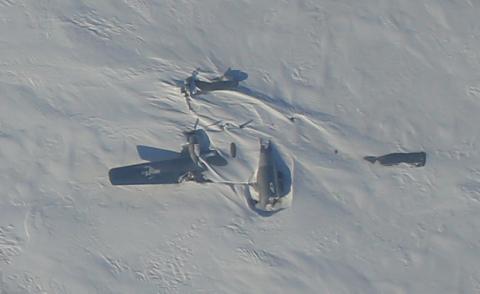The remains of the "Kee Bird", a U.S. B-29 reconnaissance aircraft which conducted an emergency landing on a frozen lake in the late 1940s, during the early days of the Cold War. The crew was eventually rescued unharmed, but the aircraft remained on the lakebed, undisturbed and almost entirely intact, until 1994. At that point a privately-financed recovery effort began, but it ended dismally one year later when the by-then flight-ready vintage B-29 caught fire during a taxi test and was destroyed. The site is located on rocky terrain between the Humboldt and Petermann Glaciers, very close aboard IceSat-2 line 1246. We directly overflew the site today.