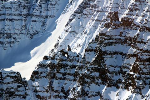 A rock arch (slightly left of and below center) and several pinnacles on another knife-edge ridge near the Geikie Plateau. Credits NASA/John Sonntag Subject Other Mission OIB