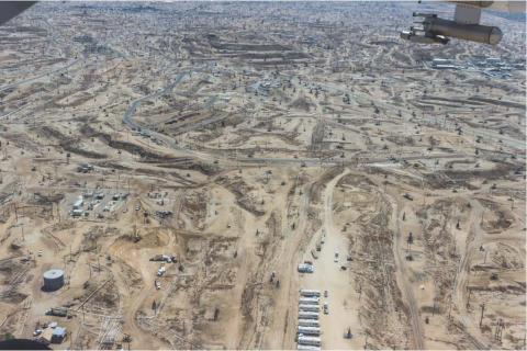 During COMEX, airborne remote sensing and in situ data were collected of oil fields in Southern California, including the Kern River oil field, shown here, where numerous oil wells produce oil. The wind sensors are visible to the upper right. Photo taken from the CIRPAS airplane during the August COMEX campaign.