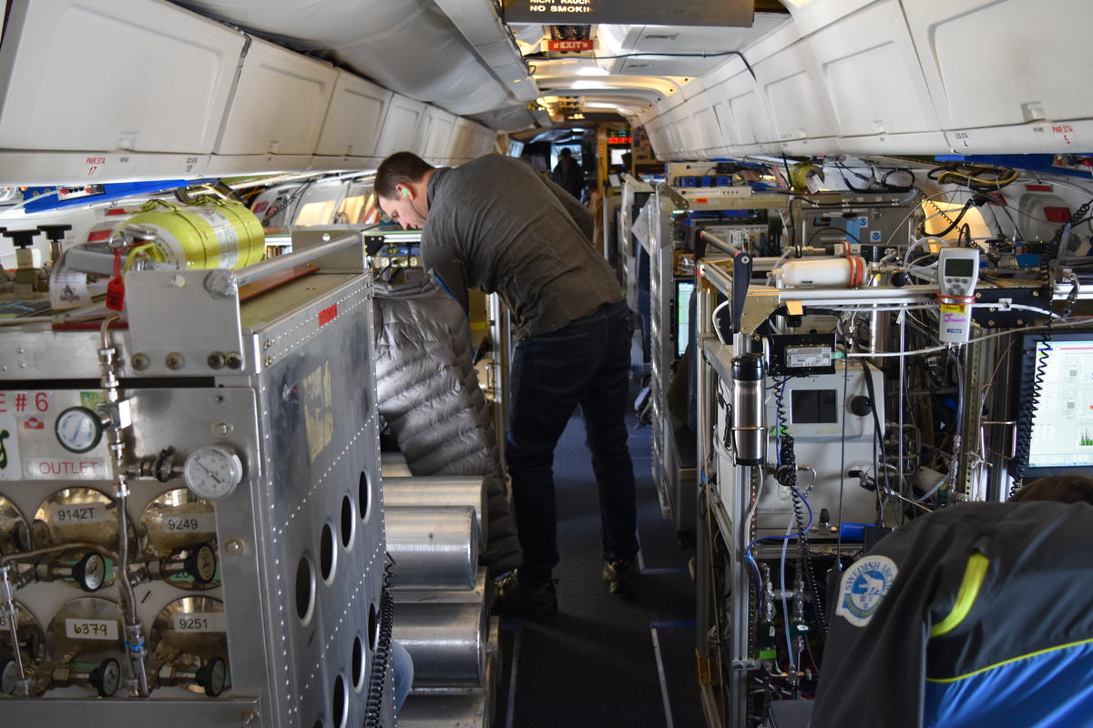 The project is called the Atmospheric Tomography Mission (the acronym AToM is pronounced AY-tom, since it's not actually an atomic study). Basically, it's a DC8, crammed full of samplers and sensors, constantly measuring things like methane, carbon dioxide, and pollutants, as the plane flies around the globe, zig-zagging up and down between 500 ft and 30-40,000 feet.
