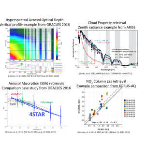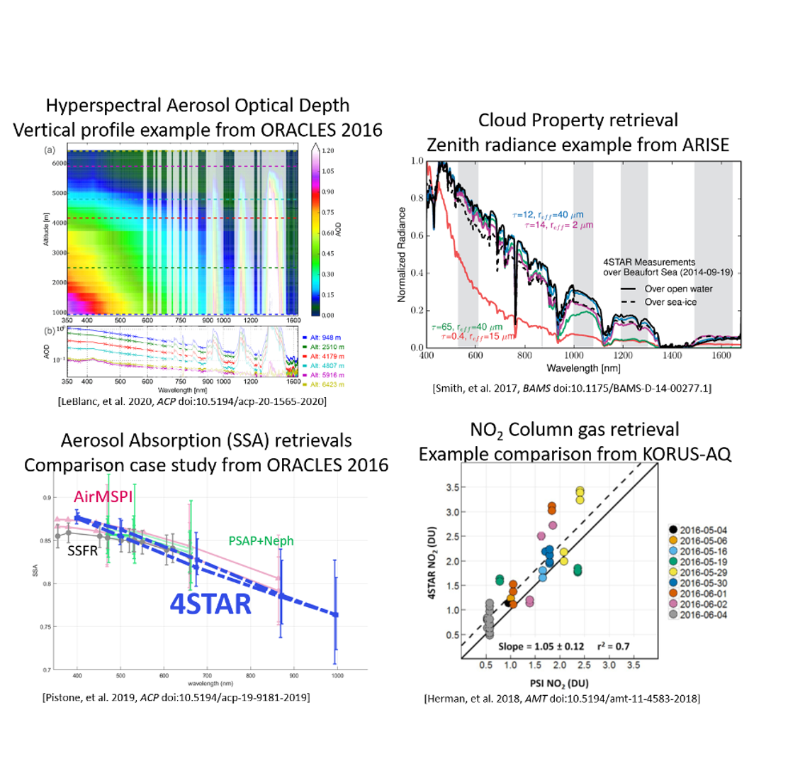 4STAR is used to quantify the attenuated solar light (from 350 to 1650 nm) and retrieve properties of various atmospheric constituents: spectral Aerosol Optical Depth (AOD) from ultraviolet to the shortwave infrared (e.g., LeBlanc et al., 2020, Shinozuka et al., 2013); aerosol intensive properties - Single Scattering Albedo (SSA; e.g., Pistone et al., 2019), asymmetry parameter, scattering phase function, absorption angstrom exponent, size distribution, and index of refraction; various column trace gas components (NO2, Ozone, Water Vapor; e.g., Segal-Rosenheimer et al., 2014, with potential for SO2 and CH2O); and cloud optical depth, effective radius and thermodynamic phase (e.g., LeBlanc et al., 2015).